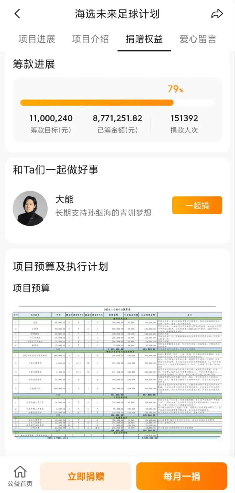 孙继海在其官方社交媒体上曾表示,“嗨球”的资金来源主要是爱心企业和人士的公益赞助,政府方面也会给出一些支持,最重要的还是“嗨球”公司其他业务的营收来进行保底。根据“嗨球”的筹款进度显示,筹集2024年6月-2025年5月的费用,已有包括孙继海好友武大靖、丁俊晖等15.1万人的捐赠,金额超过800万元,已经达目标金额1100万元的79%。根据“嗨球”公布的预算表,该周期内单是教练团队预算就接近600万元,其中公益预算金额承担一半。