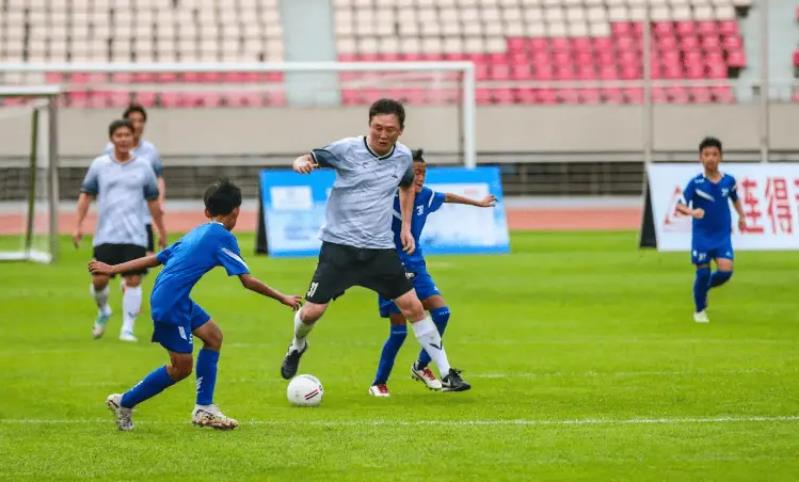 2024年7月,首届“海选未来杯”全国青少年足球邀请赛开幕式上,孙继海与小球员踢球。