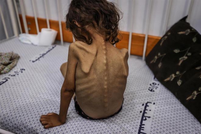 当地时间8月3日,加沙城7岁女孩梅·阿布·阿拉尔因严重营养不良生命垂危,正在患者之友协会医院接受治疗