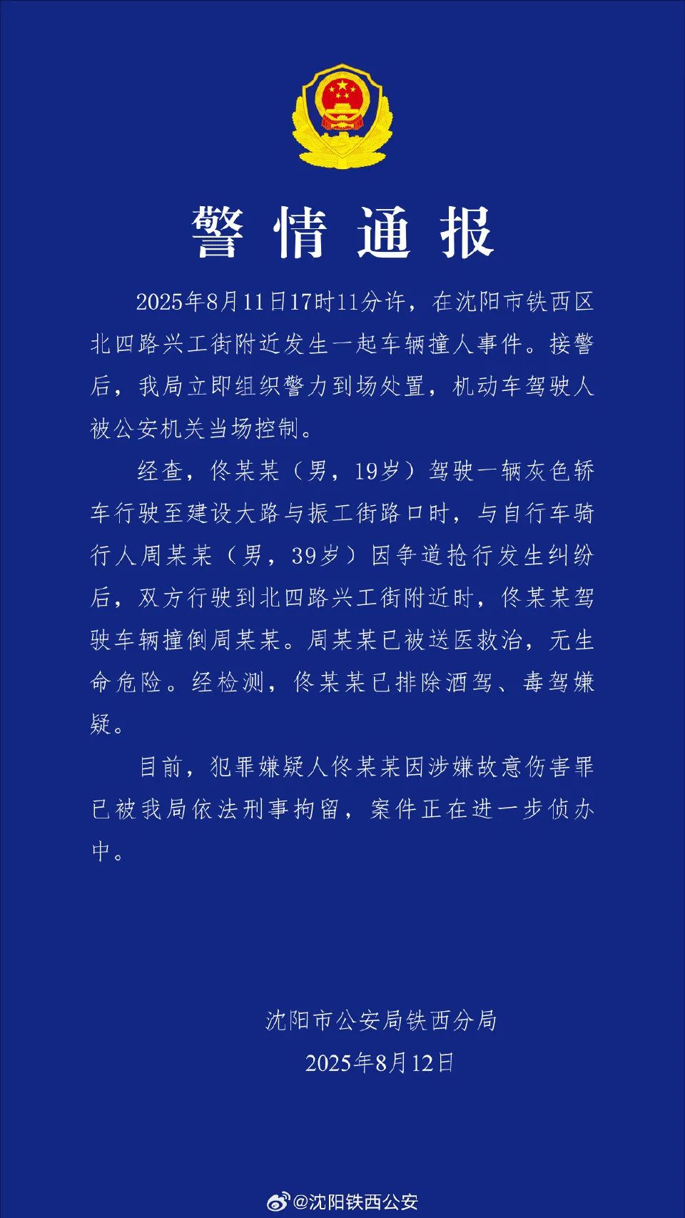 因争道抢行,19岁男子驾车反复撞击骑行者!沈阳警方通报