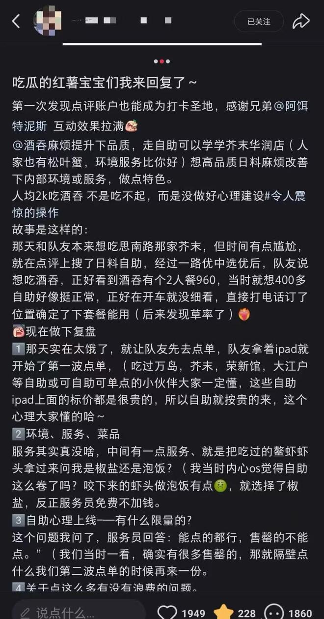 据其描述,自己曾向工作人员询问为何不提前告知该套餐不是自助性质,但对方表示,“提醒的话很不礼貌”,最终她还是支付了这笔费用。该网友表示,选择该店前曾在点评平台搜索“自助日料”,而该门店就位于搜索结果当中。并且由于该店双人套餐标价为960元,故自己也认定了此价格对应的应该是自助餐。