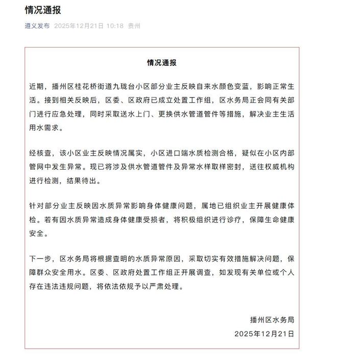 12月21日,贵州遵义市播州区水务局发布了情况通报,回应近期备受关注的九珑台小区自来水变蓝事件。通报称,已成立处置工作组,采取应急措施,并已将水样送往权威机构检测。