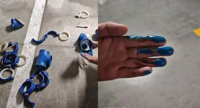 12月5日晚,有业主发现小区内有工人在夜间拆卸供水管道。出于疑虑,业主上前查看并触摸了拆下的管道,发现内壁附着大量湿滑、有颜色的油漆状物质。