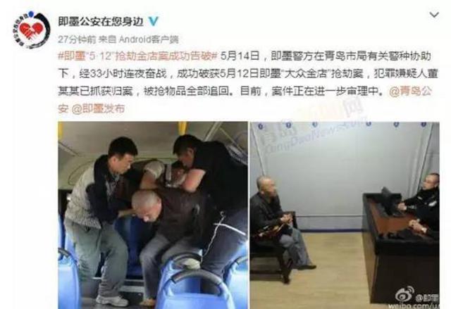 青岛新闻网5月14日讯今天,青岛新闻网从即墨市公安局获悉,今天,即墨警方在青岛市局有关警种协助下,经33小时连夜奋战,成功破获5月12日即墨“大众金店”抢劫案,犯罪嫌疑人董某某已抓获归案,被抢物品全部追回。