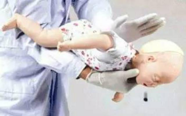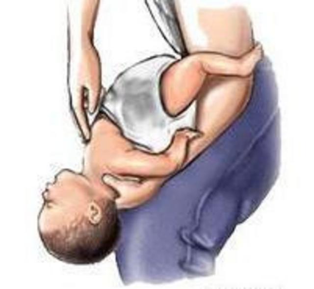 可以采取另外一个姿势,把孩子翻过来,躺在坚硬的地面或床板上,抢救者跪下或立于其足侧,或取坐位,并使患儿骑在抢救者的大腿上,面朝前。抢救者以两手的中指或食指,放在患儿胸廓下和脐上的腹部,快速向上重击压迫,但要很轻柔。重复,直至异物排出。
