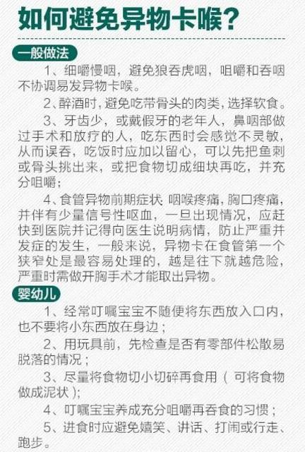 那么,一旦遇到这种情况,应该如何急救呢?徐静介绍,对于婴幼儿来说,一旦发生气管异物,家长应该立即将孩子头部朝下,用手掌拍打孩子的后背;对于成人来说,最有效的措施就是“ 海姆立克急救法”,就是让急救者从背后环抱患者,双手一手握拳,另一手握紧握拳的手,从腰部突然向其上腹部施压,力量要足以把被噎住的人带离地面,使患者的胸腔压力骤然增加,从而有可能将异物排出。