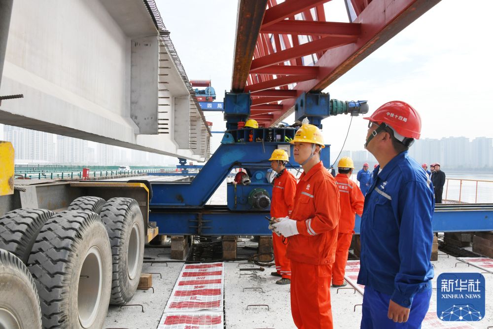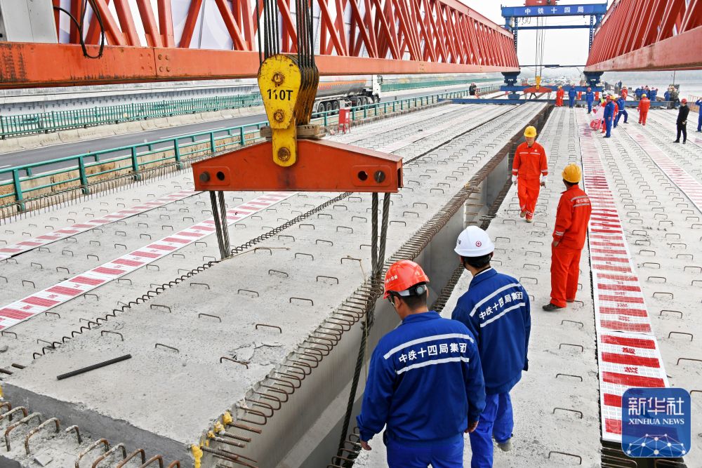 ↑ 10月30日,青兰高速公路双埠至河套段女姑口特大桥施工现场,中铁十四局建设者在吊放最后一片50米T梁。