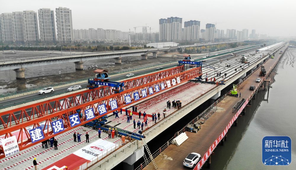 ↑青兰高速公路双埠至河套段女姑口特大桥合龙现场(10月30日摄,无人机照片)。