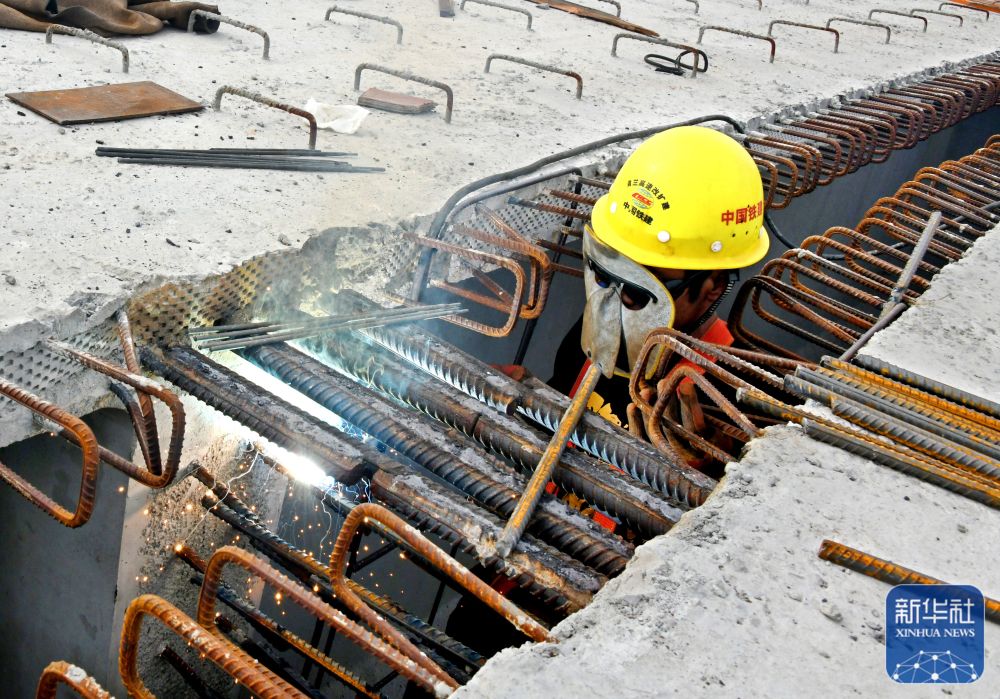 ↑ 10月30日,一名中铁十四局建设者在青兰高速公路双埠至河套段女姑口特大桥上焊接钢梁。