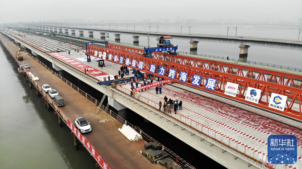 当日,国家高速公路网重要组成部分——青兰高速公路双埠至河套段女姑口特大桥顺利合龙,标志着青兰高速改扩建工程跨海段全线贯通。据介绍,该项目通车后青兰高速公路将增添一条8车道跨海大通道,有效提升与胶东国际机场立体交通互联互通能力。(新华社记者 李紫恒 摄影报道)