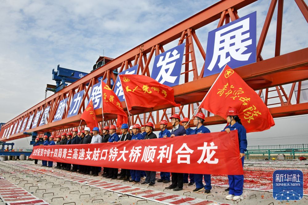 ↑ 10月30日,中铁十四局建设者在青兰高速公路双埠至河套段女姑口特大桥合龙现场庆祝。