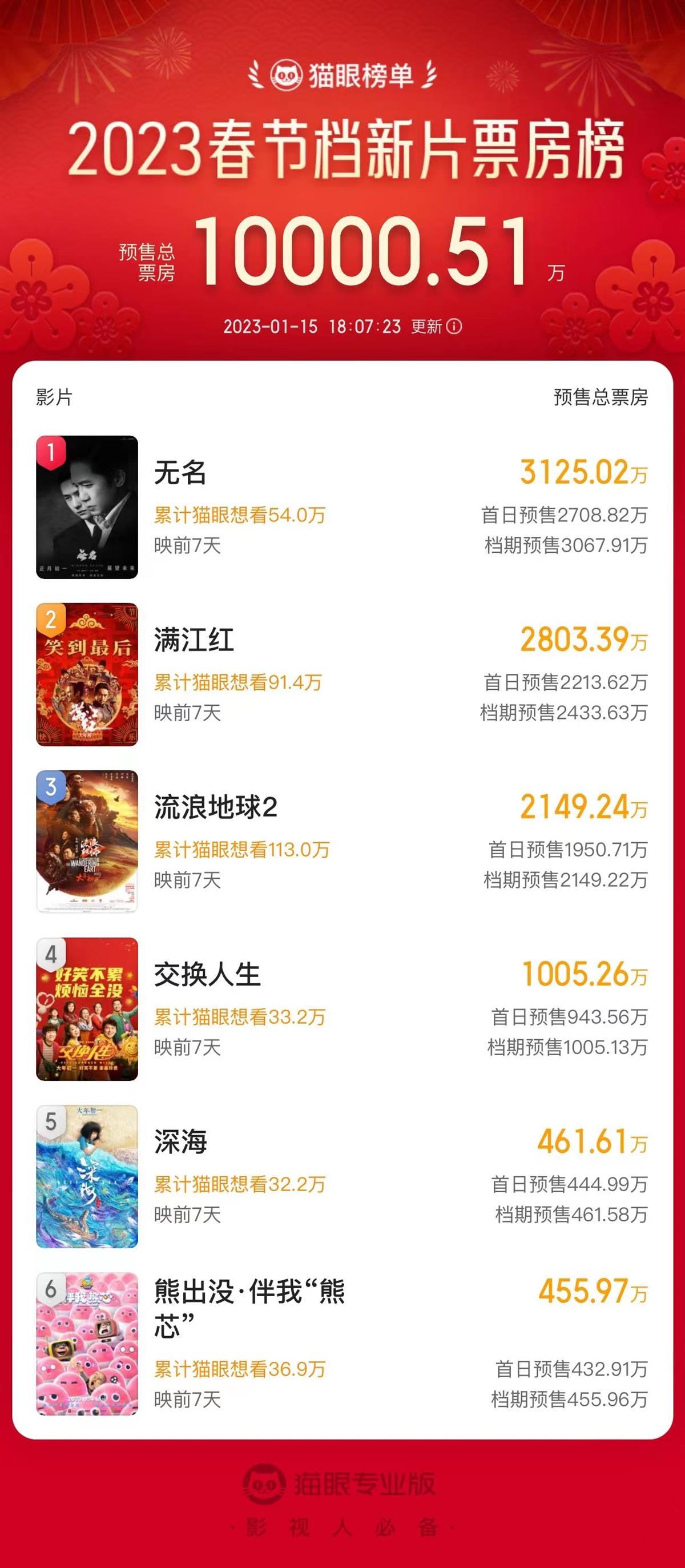 1月14日上午,今年春节档正式开启预售,为8天后大年初一的“群雄逐鹿”提前预热。截至1月15日18时许,6部春节档新片的预售总票房突破1亿元大关,其中,程耳导演的新片,由梁朝伟、王一博主演《无名》以3100万左右的成绩暂时领跑预售票房榜,排在第二、第三位的则分别是张艺谋导演新作《满江红》和吴京、刘德华主演的科幻大片《流浪地球2》。