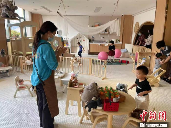 资料图:社区“宝宝屋”里,专业育儿师带着孩子做游戏。江宁路街道供图