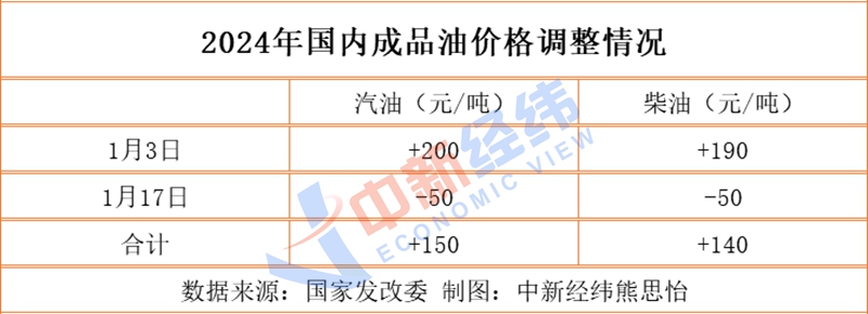2024年以来,国内成品油价已进行了两轮调整,呈现“一涨一跌”格局,汽、柴油每吨分别累计涨150元、140元。若本次上调兑现,国内成品油价将呈现“两涨一跌”格局。