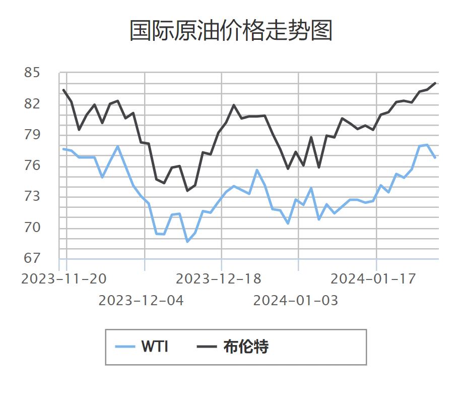 本轮计价周期内,国际原油价格震荡走强,29日稍有回落。数据显示,WTI 3月原油期货29日收跌1.23美元,跌幅1.58%,报76.78美元/桶。布伦特3月原油期货29日收跌1.15美元,跌幅1.38%,报82.4美元/桶。