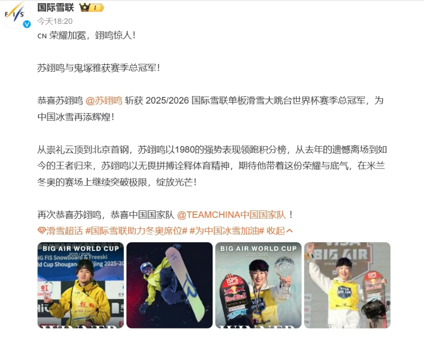 国际雪联恭喜苏翊鸣为中国冰雪再添辉煌,并写道:“从崇礼云顶到北京首钢,苏翊鸣以1980的强势表现领跑积分榜,从去年的遗憾离场到如今的王者归来,苏翊鸣以无畏拼搏诠释体育精神,期待他带着这份荣耀与底气,在米兰冬奥的赛场上继续突破极限,绽放光芒!”