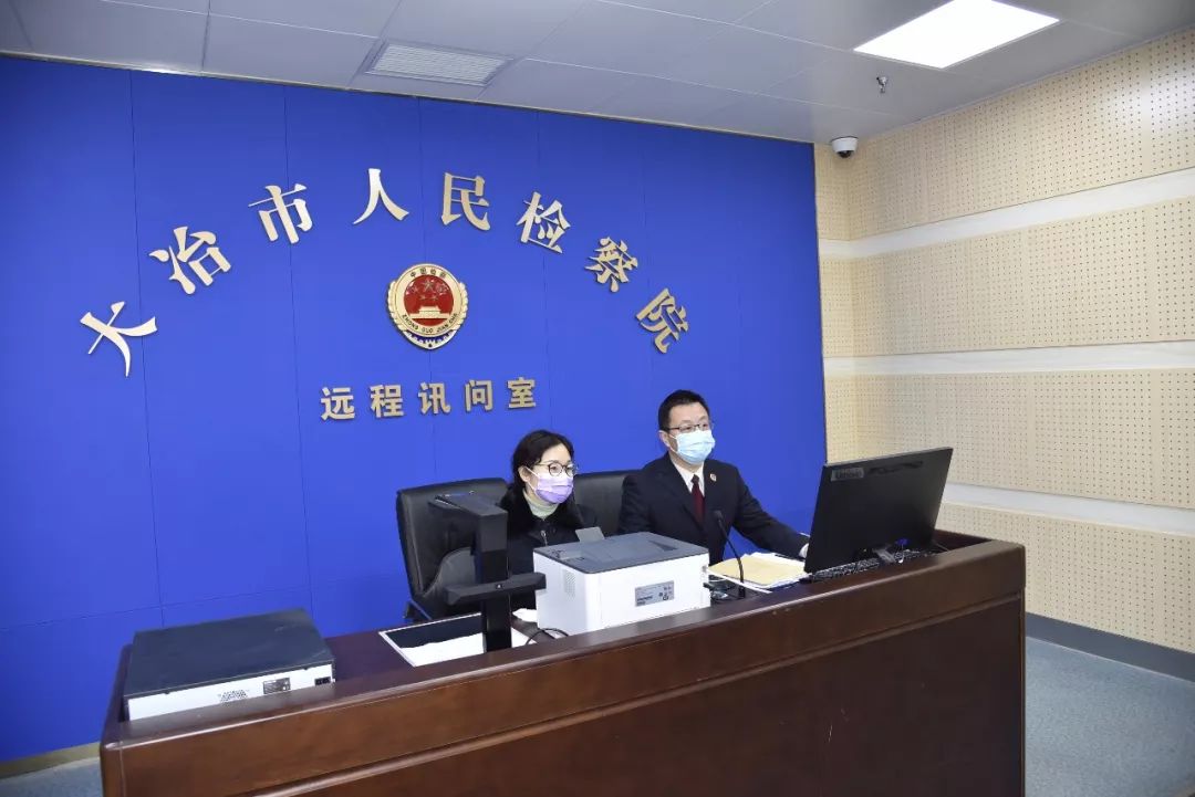 2月13日,在湖北省大冶市检察院的远程讯问室内,该院第二检察部检察官袁龙(右)、书记员张丽(左)正通过远程视频系统,与一名涉嫌串通投标罪的犯罪嫌疑人王某“隔空对话”。