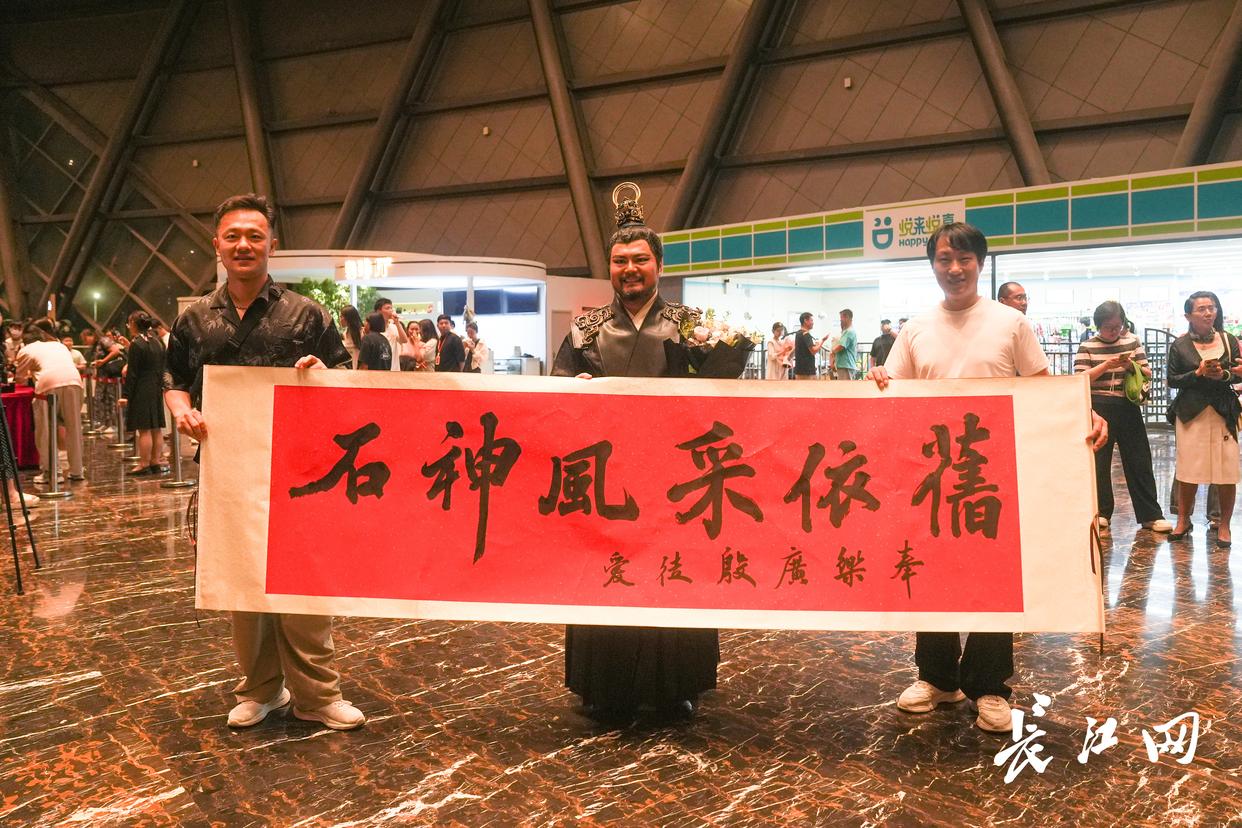谢幕后,还没卸妆的石伟老师和两位弟子在剧场外签名互动区重逢,拥抱并合影。王凯说,“看了这个剧,又和演了剧中‘先王和未’的石老师见面,特别激动、感动!这部剧从编排、阵容、舞台布景和音乐各方面,都挺新颖的!至少这两年,在河南没有出现这类剧。希望我的第二故乡湖北,在舞剧创作方面越来越好!”