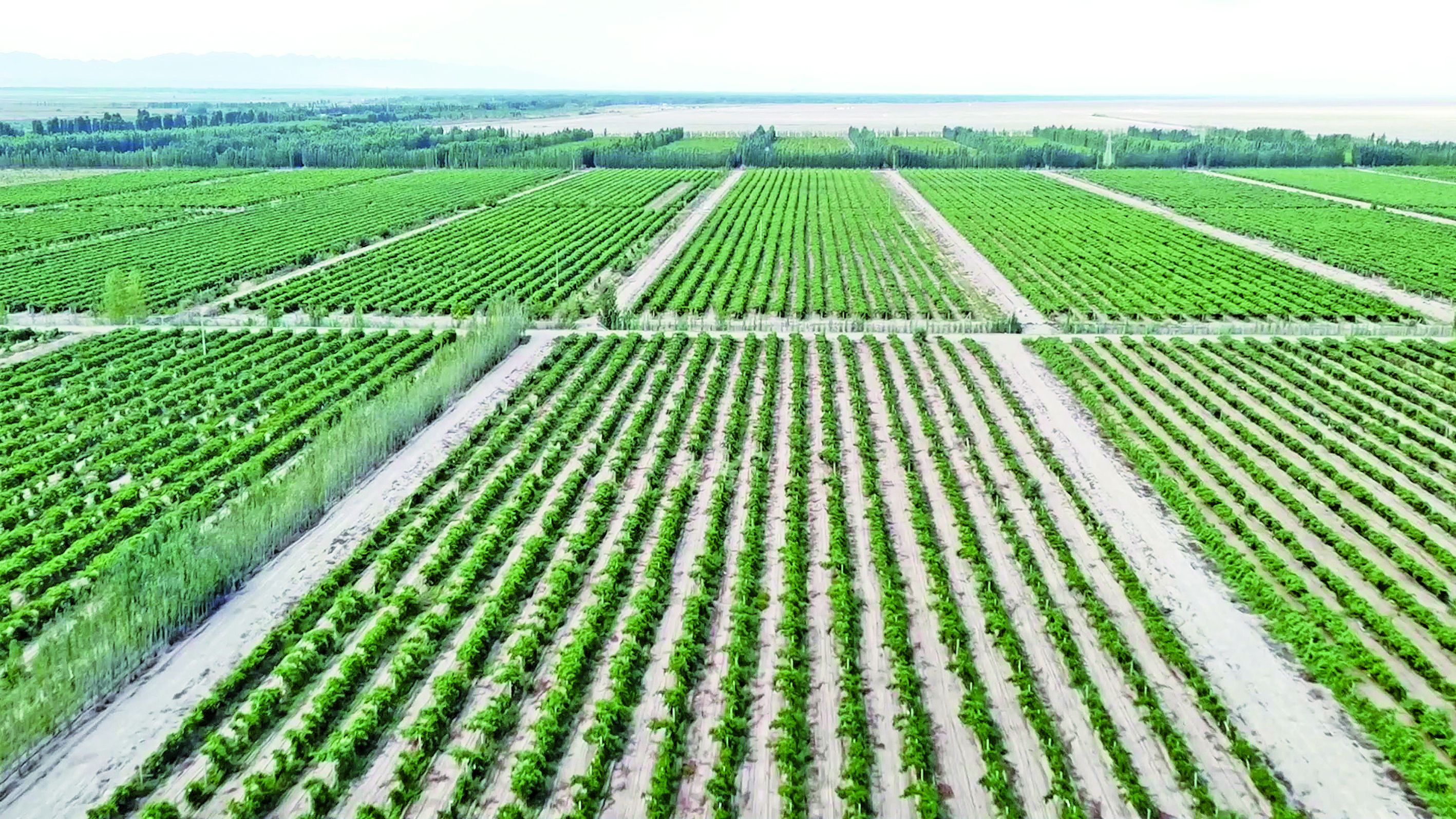 位于戈壁滩的拜城县克赛葡萄基地一派生机勃勃的景象。