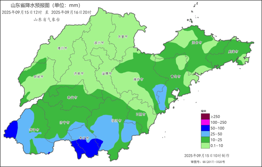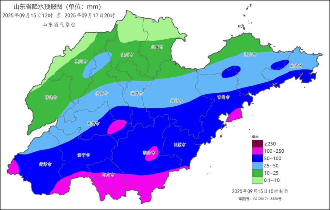 9月15日12时—17日20时山东省累积降水量预报(毫米)