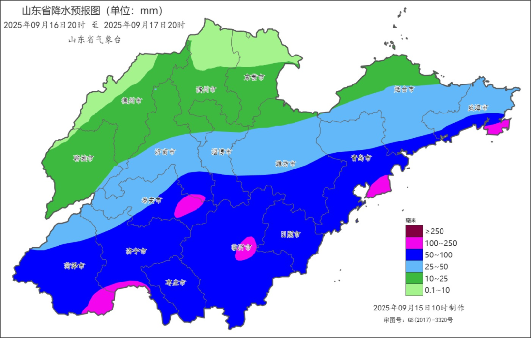 9月15日12时—16日20时山东省降水量预报(毫米)