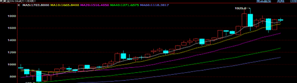 黄金看盘 今晨(18日)纽约商业交易所4月份交割的黄金期货价格收盘下跌2.50美元,报收于每盎司1725.90美元,跌幅为0.1%。在当周的交易中,纽约黄金期货价格累计上涨0.03%。源于市场对欧元区各国将与希腊达成第二项援助计划感到乐观,从而削弱了投资者买入黄金期货以规避风险的需求。 技术面:K线收报阳T字线,均线趋向粘合。指标看;BOLL线口持稳,金价获中轨支撑,MACD绿柱体伸长,日KDJ拐头向上趋势,提示指标有转好趋势。 持仓:Wind资讯统计数据显示,截至周四(2月16日),全球最大黄金上市交易基金(ETF)-SPDR Gold Trust黄金持仓量为4119.4581万盎司或1281.28吨,较上一交易日增加99179盎司或0.24%。 总体看:今日金价探底回升,走势继续维持了小箱体震荡走势,技术面提示本周有望打破1710美元至1738美元小箱体震荡区域,投资者可逢低小多单逐步介入,当周应关注黄金与美元负相关的表现。由于欧美国家宽松的货币政策继续对金价形成正面效应,长期看黄金作为抵御通胀、保值避险的配置组合来考虑。 美期金(4月合约)周K线图