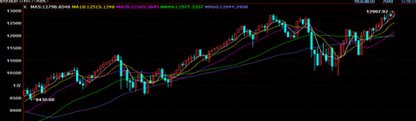 【每日欧美股指晨评】 美国三大股指 (18日清晨)美国三大股指涨跌不一,道指创2008年5月19日以来收盘新高,上涨46.02点,涨幅为0.36%。全周道指上涨1.16%,纳指上涨1.65%,标普500指数上涨1.38%。美国上周首次申请失业救济人数降至四年新低,增强了投资者信心,截至收盘,道琼斯工业平均指数上涨123.06点,报12,904.01点,涨幅为0.96%;纳斯达克综合指数上涨44.02点,报2,959.85点,涨幅为1.51%;标准普尔500指数上涨14.82点,报1,358.05点,涨幅为1.10%。道指盘中平开高走,日K线再报中阳线,短中期均线系统呈现多头排列,对股指形成助涨。指标看,日KDJ高位金叉上行。MACD红柱体延续,BOLL线口持稳,多头市道。总体看;指标强势修正,多头主动明显。 美道琼斯周K线图