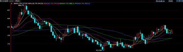 美元指数周评 美元指数周评 本周各种利好、利空的消息不断,美元指数冲高回落未能收上80大关,美元周K线报收上影较长的小阳线,出现止跌企稳迹象,下周有再度上攻79.52初步压力位动能,美国量化宽松前景以及欧洲债务危机成为美元汇率市场走向的主导因素,如果美国经济数据的持续好转将对第三轮量化宽松政策带来不确定性,将刺激美元反弹。由于技术面提示美元正在构筑中期底部,短期将维持窄幅震荡格局,下周建议低多。 美元汇率周K线