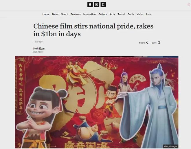 另一个备受关注的例子,则是BBC大篇幅地报道了中国电影《哪吒2》票房屡创佳绩的新闻,不仅称赞了电影本身和中国电影市场的发展,还肯定了主创团队的创作历程。