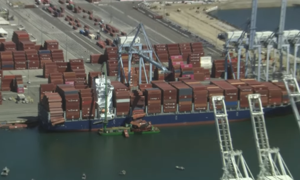 美国海岸警卫队在社交平台X上表示,大约67个集装箱落水。部分集装箱疑似砸中船侧用于收集排放物的反污染船“STAX 2”。(央视记者 刘骁骞)