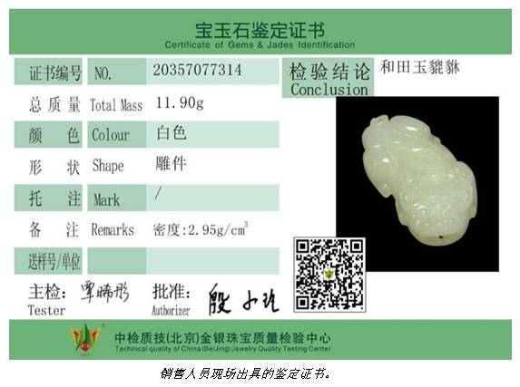 而从现场,销售人员出示的鉴定证书上看,仅对宝石的真假做了鉴定。至于品质,只能靠消费者自己去判断。