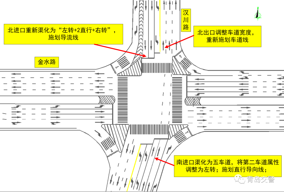 1.汉川路北进口渠化为四车道,车道属性为“左转+2直行+右转”,施划导流线;北出口调整车道宽度,重新施划车道线。
