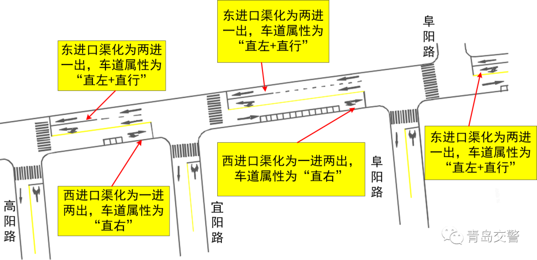 2.汉川路南进口渠化为五车道,车道属性调整为“2左转+2直行+右转”;施划直行导向线,引导车辆有序行驶。