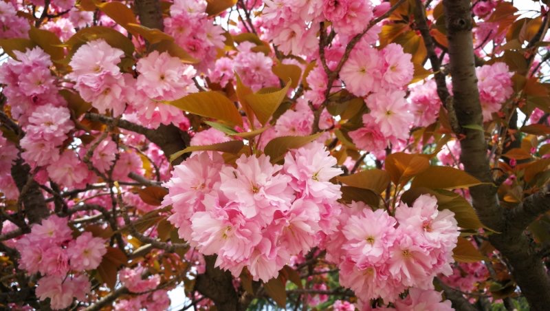 双樱也称晚樱,与单樱一起虽然都叫樱花,但风格迥然不同,花朵以饱满、丰腴之美倍受人们喜爱。双樱较单樱盛开时间要晚,颜色也更鲜艳。镜头所到之处,那满树浅粉色、深粉色、粉白相间的樱花,正开得轰轰烈烈。