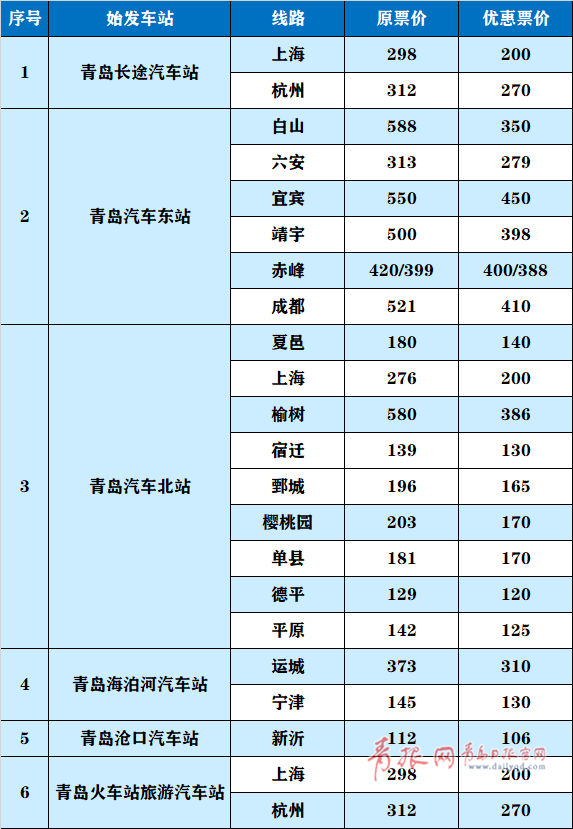 青岛日报/青岛观/青报网讯 4月28日,记者从交运集团青岛汽车总站了解到,为进一步促进复工复产及市民便捷出行,青岛汽车总站扩大复运线路实行优惠票价活动的数量及力度,此次活动涉及总站所属6个汽车站的22条线路。