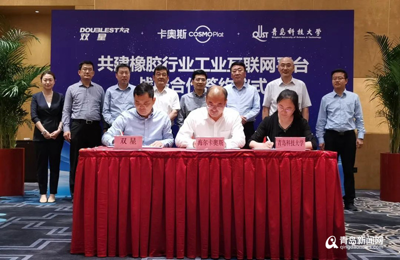 青岛新闻网6月9日讯(记者 刘倩倩)6月8日,双星集团、海尔卡奥斯、青岛科技大学在海尔洲际酒店举行共建橡胶工业互联网平台战略合作签约仪式。海尔集团总裁周云杰,双星集团董事长柴永森,青岛科技大学校长陈克正,市国资委主任、党委书记马卫刚出席签约仪式。