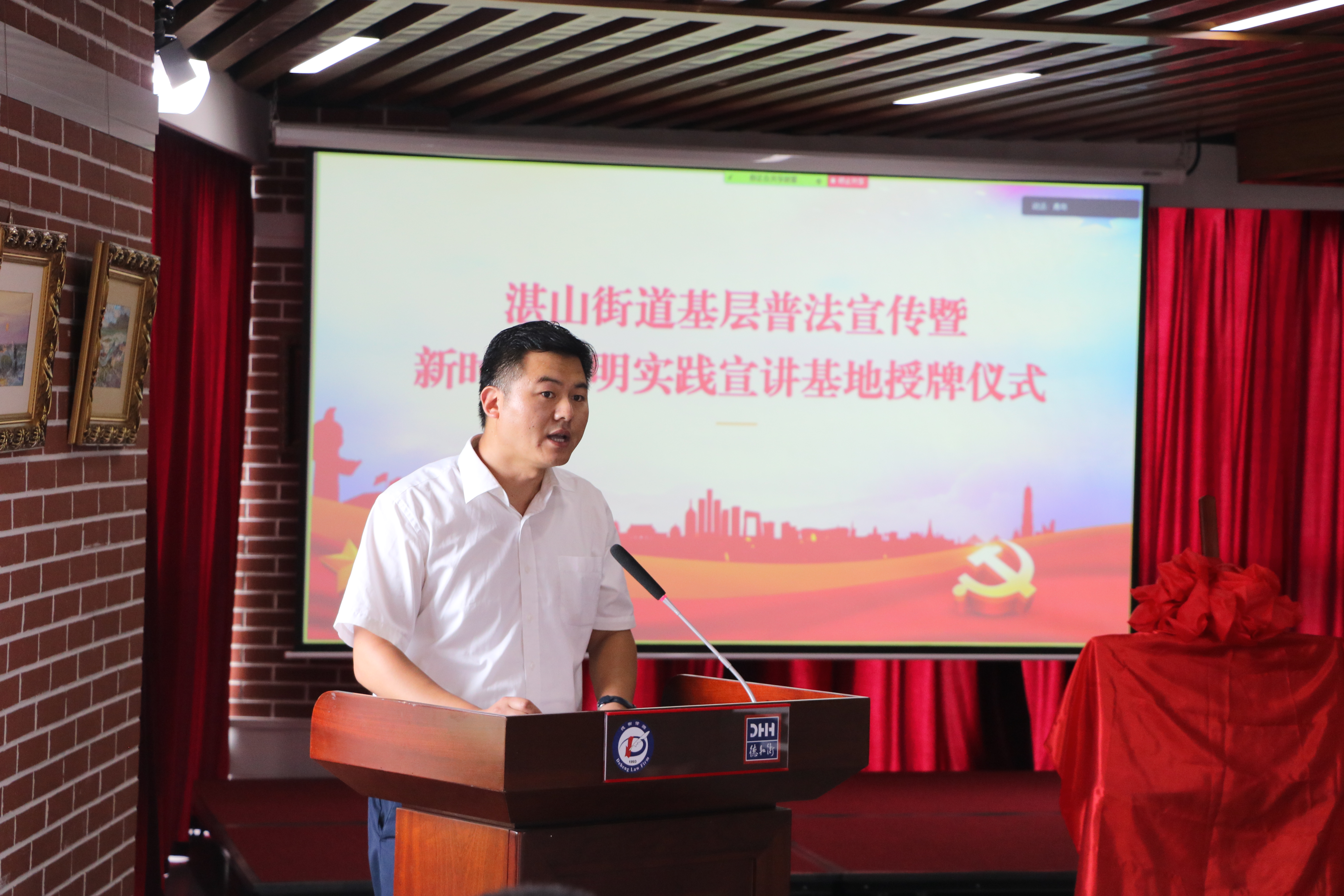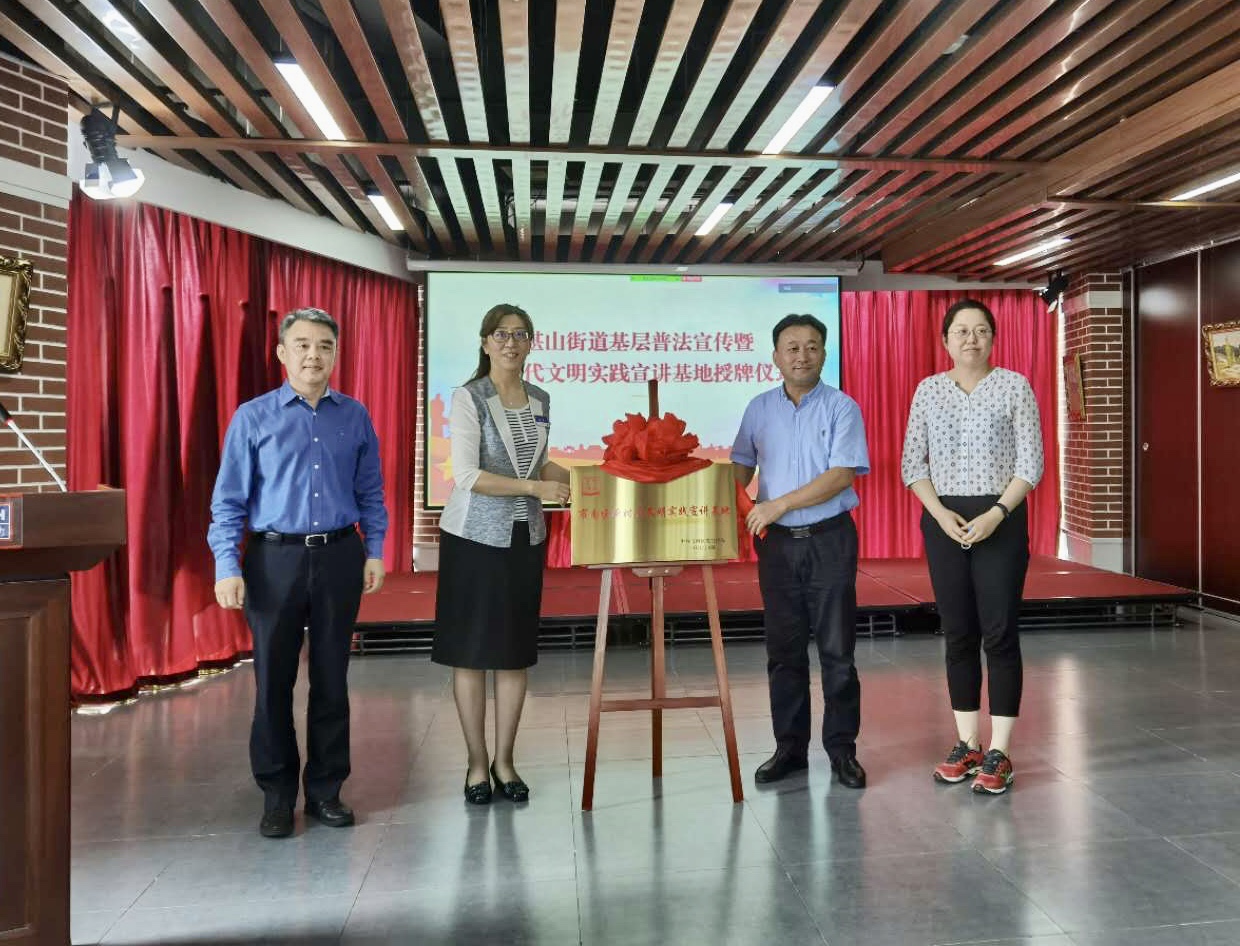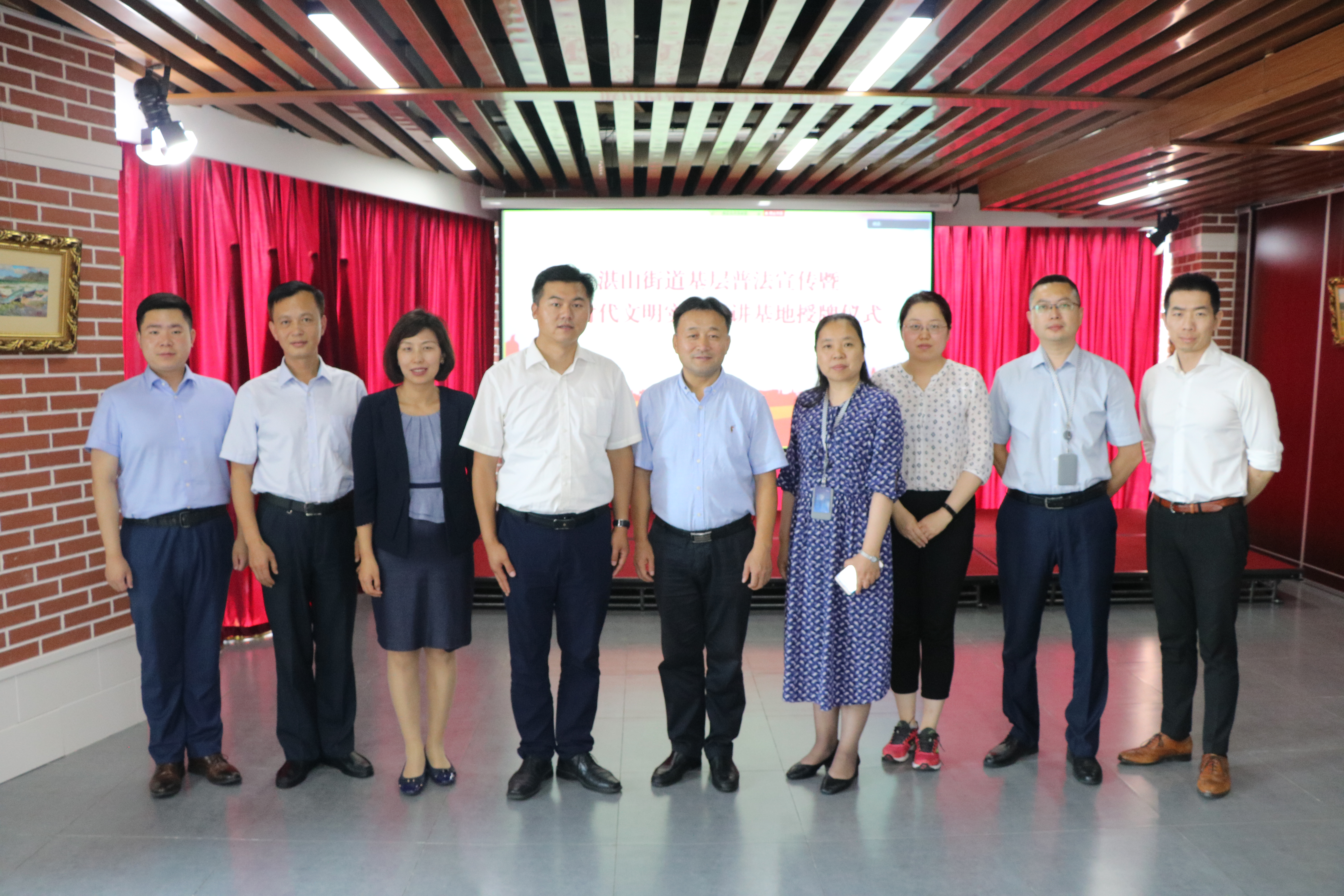 7月9日下午,湛山街道基层普法宣传动员会暨新时代文明实践宣讲基地授牌仪式如期举行,市南区最新一处新时代文明实践宣讲基地在海航万邦正式落成。区委宣传部常务副部长、网信办主任孔兆锋,湛山街道党工委副书记、党建工作办公室主任孟广瑞,山东德衡律师事务所党委书记胡明、副书记李旭修共同为基地揭牌。