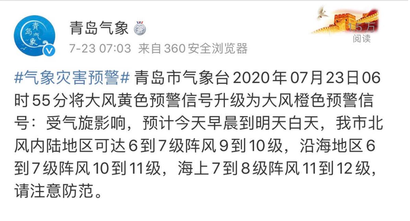 青岛新闻网7月23日讯 青岛市气象台2020年07月23日06时55分将大风黄色预警信号升级为大风橙色预警信号:受气旋影响,预计今天早晨到明天白天,我市北风内陆地区可达6到7级阵风9到10级,沿海地区6到7级阵风10到11级,海上7到8级阵风11到12级,请注意防范。