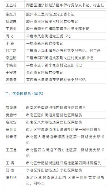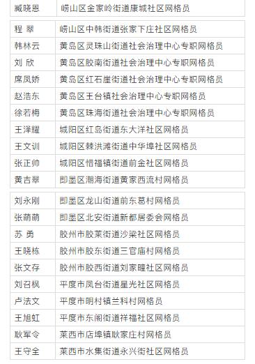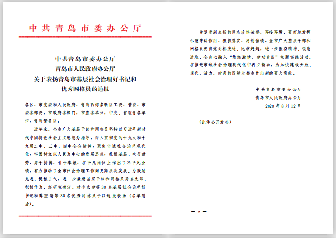 近年来,全市广大基层干部和网格员坚持以习近平新时代中国特色社会主义思想为指导,扎根基层、吃苦耐劳,勇于拼搏、甘于奉献,在平凡岗位上作出了不平凡业绩。为鼓励先进、提振士气,市委办公厅、市政府办公厅近日印发《关于表扬青岛市基层社会治理好书记和优秀网格员的通报》,对全市30名基层社会治理好书记和30名优秀网格员予以通报表扬,进一步激励基层干部和网格员勇当先锋、积极作为,为加快建设开放、现代、活力、时尚的国际大都市作出新的更大贡献。