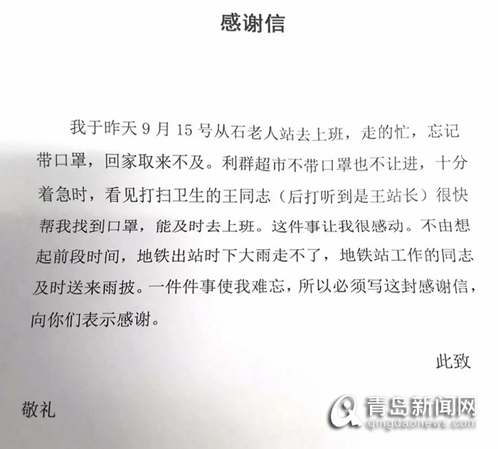 9月16日,一位退伍老兵来到地铁站,将一封言语朴实却真挚的感谢信送到地铁工作人员手中,并再三感谢青岛地铁人的暖心服务,信中写道:“一件件事使我难忘,所以必须写这封感谢信,向你们表示感谢。”