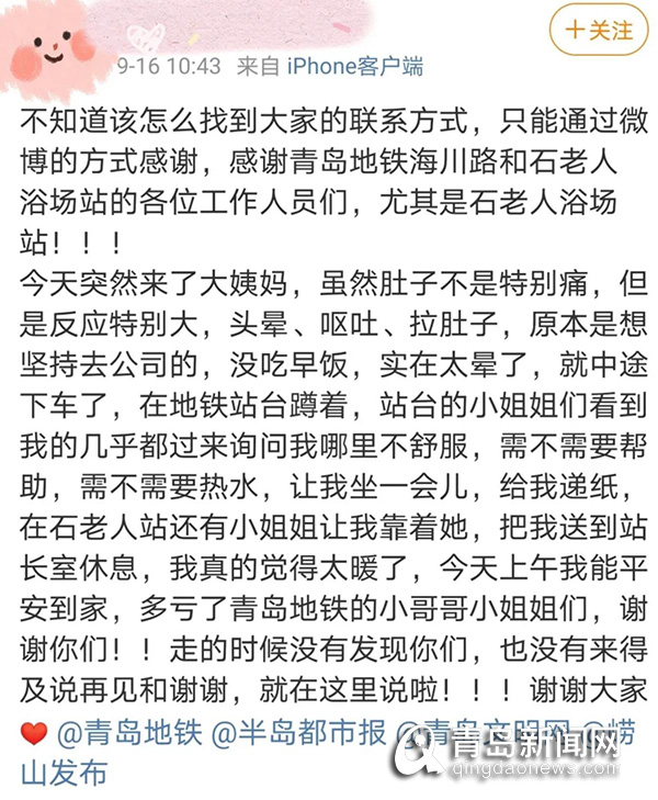 无独有偶,9月16日,青岛地铁收到了这样一条感谢微博,字里行间是对地铁工作人员的诚挚谢意,“我真的觉得太暖了,今天上午我能平安到家,多亏了青岛地铁的小哥哥小姐姐们……”