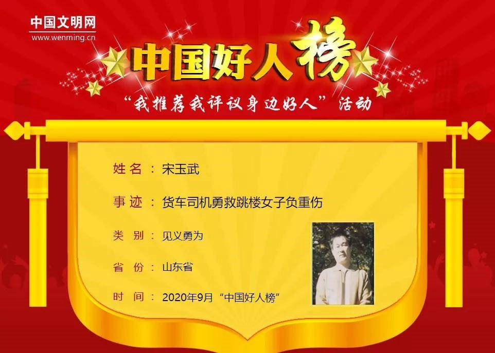 青岛日报社/观海新闻11月3日讯 近日,在中国文明网举办的“我推荐我评议身边好人”活动中,“平度大哥”宋玉武荣登“中国好人榜”。
