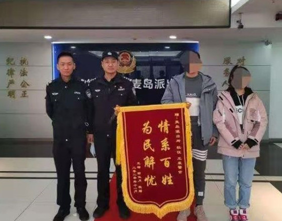 11月23日下午,被救助的两名大学生来到麦岛派出所,将一面印有“情系百姓,为民解忧”的锦旗送给救援民警,并表示感谢。