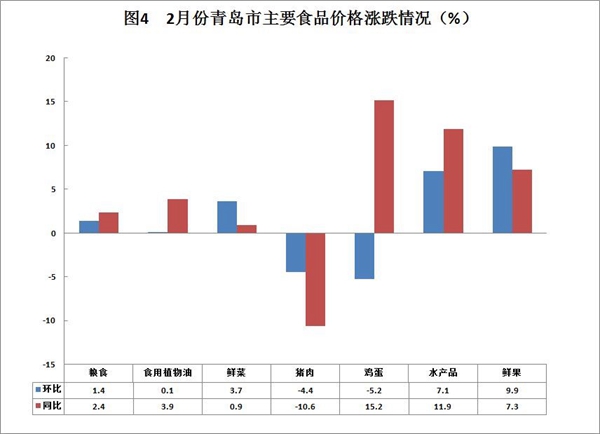政策调整导致部分公共服务类价格下降。春节期间(2月11日-17日)高速、隧道、跨海大桥等收费公路免费通行,青岛市内公交车免费乘坐,拉动车辆使用费和市内公共交通价格环比分别下降20.6%、13.4%;同时,海底世界等部分景点春节期间开展优惠活动,影响景点门票价格环比下降4.5%。