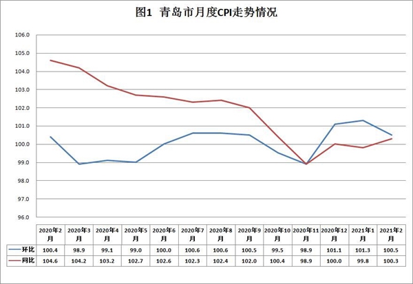 青岛新闻网3月10日讯(记者 刘倩倩)记者从国家统计局青岛调查队获悉,2021年2月,青岛市居民消费价格(CPI)同比上涨0.3%,与上月相比止跌回升;环比上涨0.5%,涨幅较上月收窄0.8个百分点;1-2月份累计持平。分类别看,2月份食品价格同比上涨2.6%,非食品价格同比下降0.2%;消费品价格同比上涨0.1%,服务价格同比上涨0.7%。