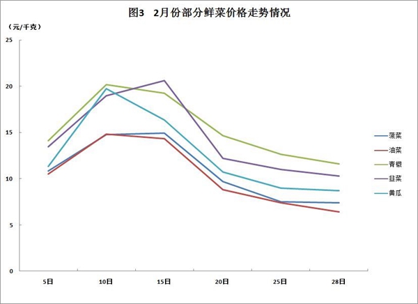 鲜菜价格小幅上涨。2月份鲜菜价格环比上涨3.7%,从全月监测情况来看,2月份鲜菜价格呈先涨后跌的“∧”型走势。春节前夕,鲜菜需求量增加,加之成本增加,价格迅速攀升,尤其是绿叶类蔬菜,由于较难长期存储,价格上涨更为明显;春节过后,随着农贸市场逐步恢复正常营业,市场供应量上升,主要鲜菜价格逐步回落。整体来看,在重点监测的24种鲜菜品种中,有15种环比上涨,其中芸豆角价格环比上涨47.2%,涨幅居首位,生菜(球)、韭菜、青椒、黄瓜、胡萝卜、黄豆芽的价格环比涨幅也均超过10%;而菜花、茄子、生姜价格则环比下降超过一成。