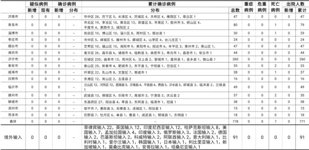 山东无新增本地疑似病例、确诊病例。累计报告确诊病例778例,死亡7例,治愈出院771例。