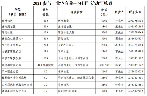今年“北宅有我一分田”活动共有大崂、晖流和五龙涧3个社区及沐恩格林四季农场、老雷家家庭农场等9个农业园区12处“一分田”基地供市民和游客选择,可供租赁土地约1400份。