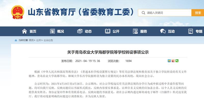青岛新闻网4月21日讯 (记者 陈志伟)近日,山东省教育厅发布公示,青岛农业大学海都学院、聊城大学东昌学院拟转设为独立设置的民办本科高校。