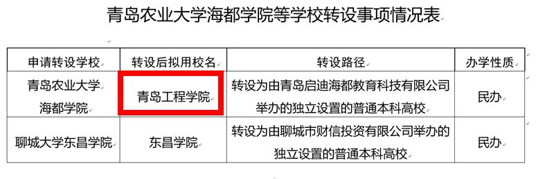 据悉,青岛农业大学海都学院拟转设并更名为“青岛工程学院”,为青岛启迪海都教育科技有限公司举办的独立设置的普通本科高校,办学性质为民办。